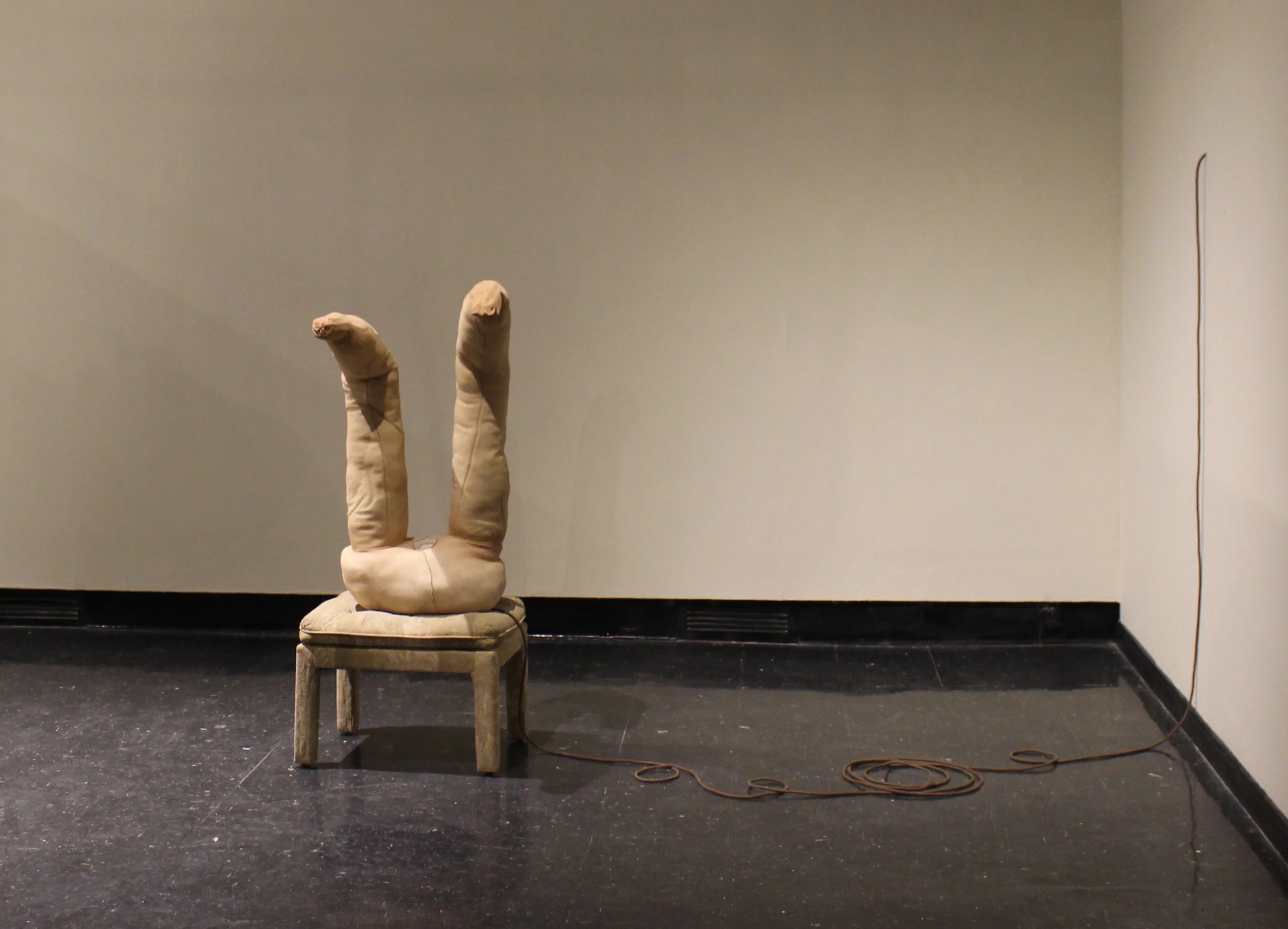 queen nylons, stuffing, blanket, footstool, small motors, switch, electrical cord, mixed media, 47" x 22" x 16", 2016